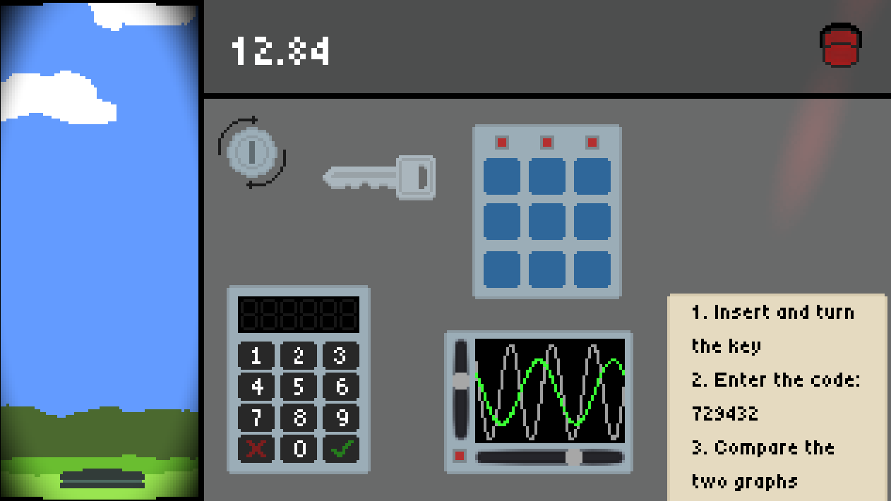 You become a control center operator who must prevent a false missile launch. In 20 seconds, you must solve 3-4 different types of puzzles. Each successfully completed task brings you closer to preventing the launch. The tense atmosphere is created by music, flashing alarms, and a relentlessly ticking timer. The goal is to complete everything before time runs out.